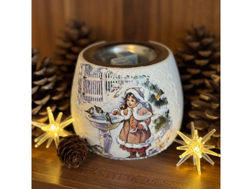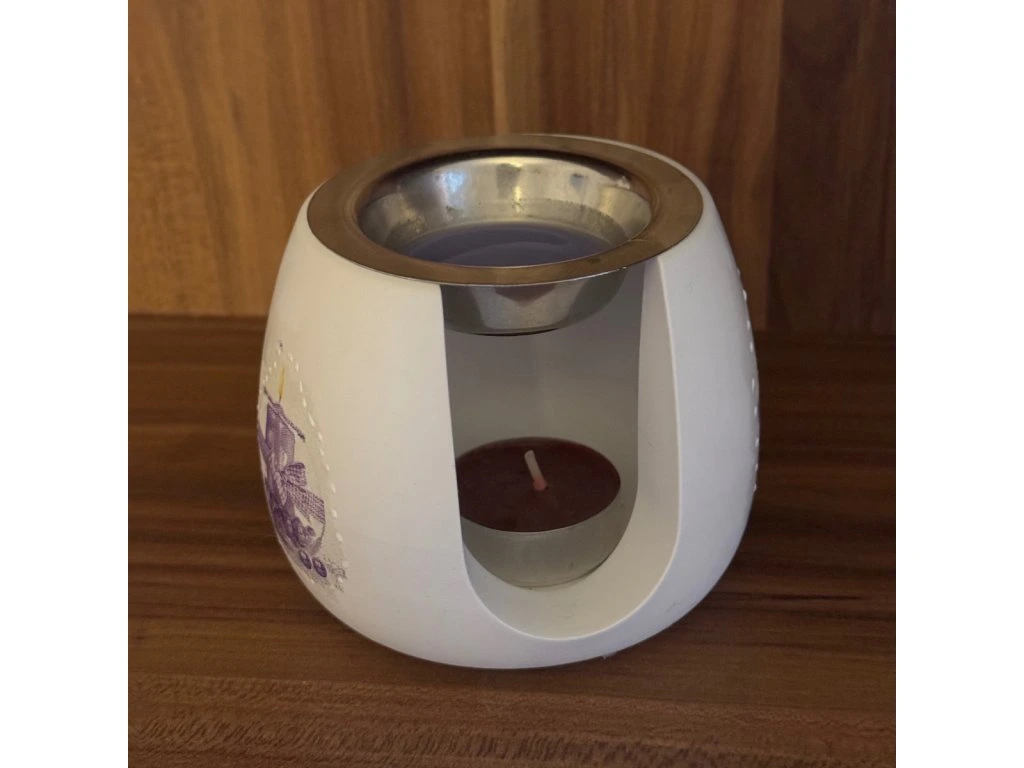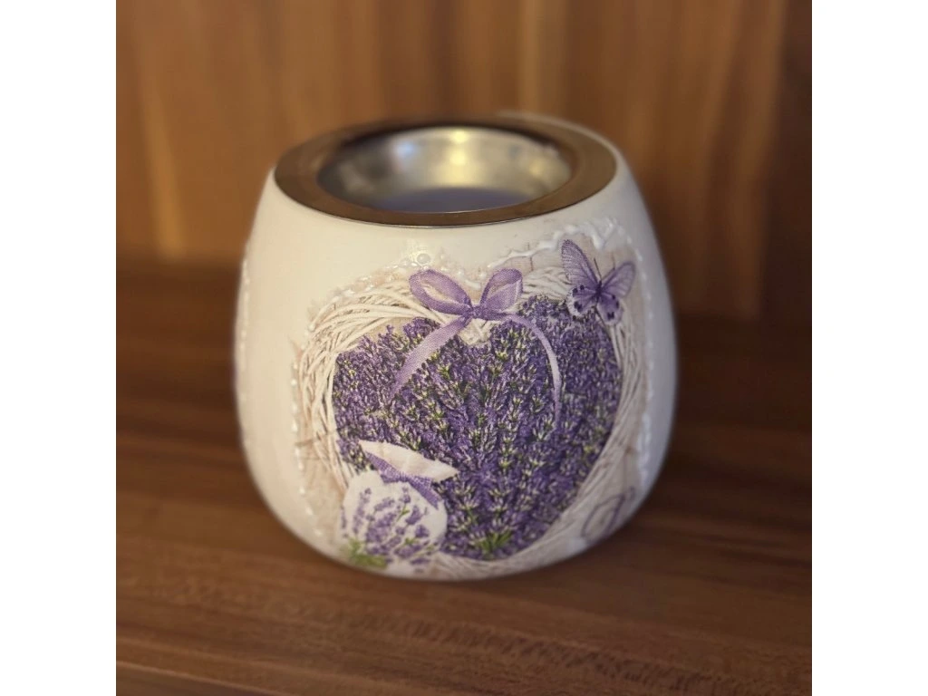 Přední strana lampy je zdobena technikou decoupage, povrch je hladký a matný. Vrchní kovová miska slouží k ohřevu vonného vosku nebo esenciálního oleje, spodní část je určena pro čajovou svíčku.