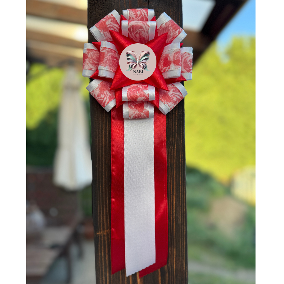 Výrazná kokarda v kombinaci sytě červené a elegantní bílé barvy je ozdobena romantickým motivem růží. Ideální jako slavnostní ocenění na výstavách psů, dekorace na dárky nebo tematické události. Díky dlouhým stuhám působí honosně a reprezentativně.