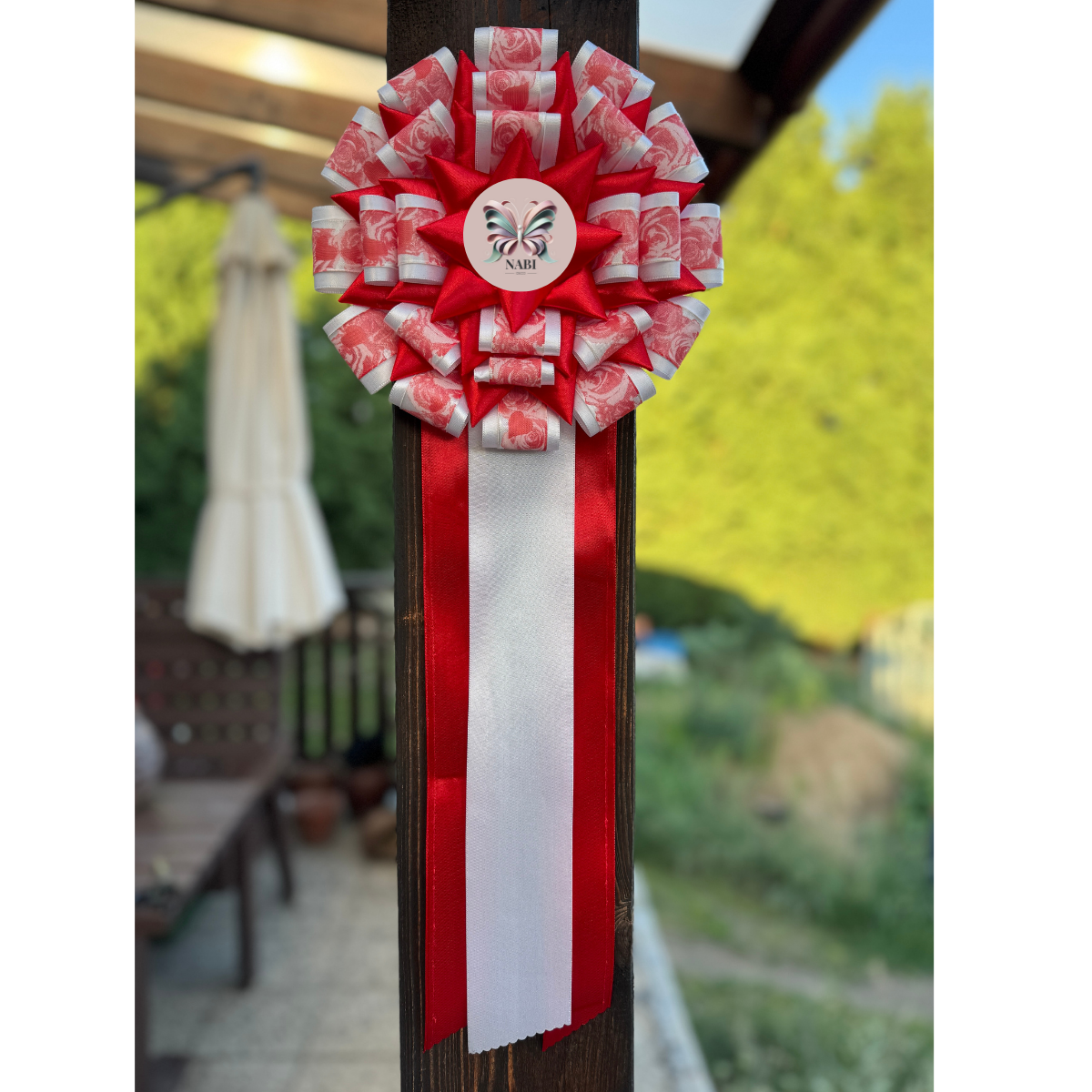 Luxusní vícevrstvá kokarda s romantickým motivem růží v jemných odstínech růžové a bílé, doplněná sytě červenými saténovými špičkami. Tato slavnostní kokarda upoutá pozornost svou výrazností a propracovaným provedením. Je ideální jako hlavní ocenění na výstavách psů, slavnostní události, tematické dekorace nebo jako reprezentativní dárek.