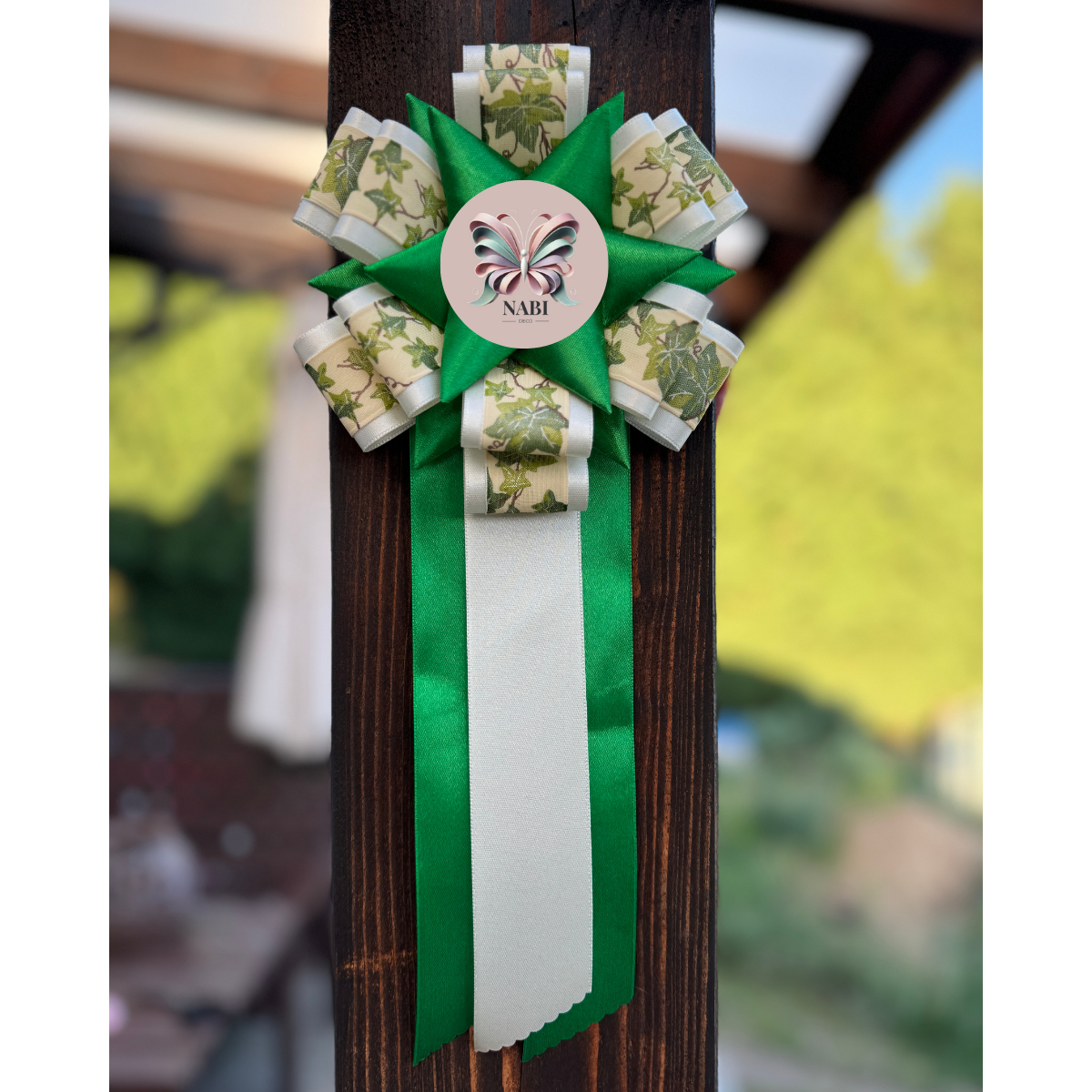 Výrazná zeleno-krémová kokarda s přírodním motivem břečťanu je dokonalou volbou pro slavnostní příležitosti i jako ocenění na výstavách psů. Kombinace syté zelené saténové stuhy a detailního potisku listů vytváří elegantní a přitom přirozený dojem. Dlouhé stuhy na zavěšení či popis dodávají celému designu na výjimečnosti.