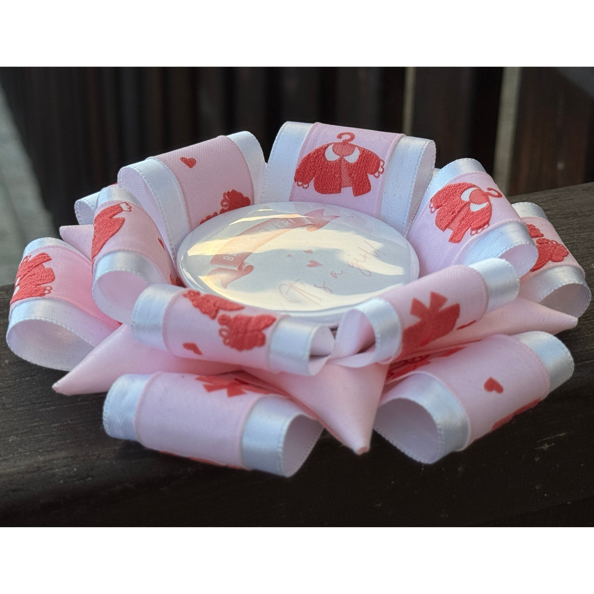 Sladká růžová kokarda se stříbrným lemem a veselými motivy dětských šatiček, sloníků a srdíček. Ideální pro baby shower, narození holčičky nebo jako doplněk k výjimečnému dárku.